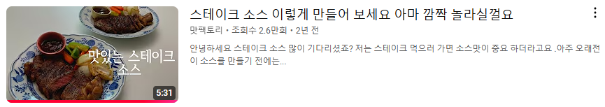다이어트하다보니 처음엔 다이어트 식단을 검색했습니다. 그러다 보니 먹방이 연관되어 올라옵니다. 유튜브 상단에 추성훈 도쿄 스테이크 먹방을 보고 당장 도쿄에 가서 먹어 볼수 없는 저는 마늘이 안들어간다는 그 소스 레시피를 찾아봅니다.